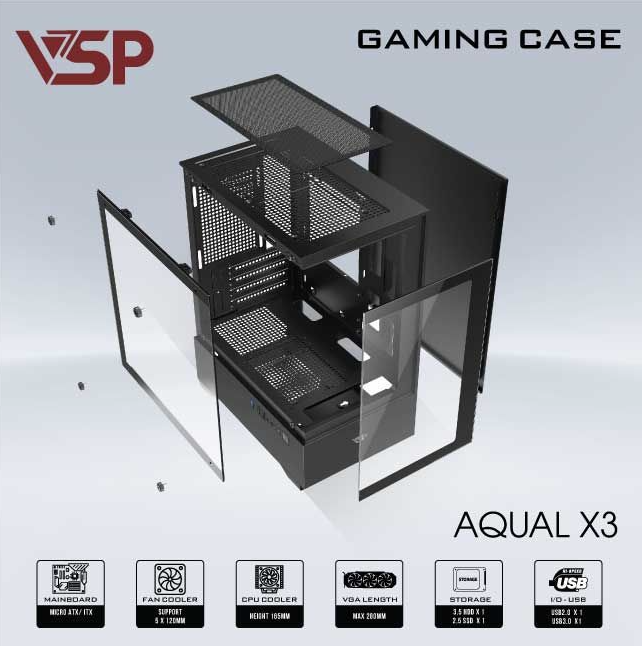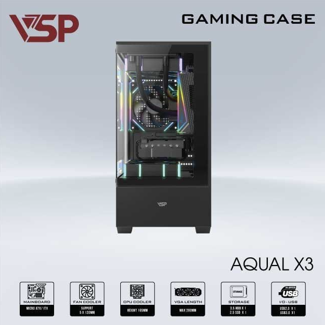 Vỏ case máy tính VSP AQUANAUT PRO GAMING M-ATX X2 GALAXY - Màu đen, không kèm fan