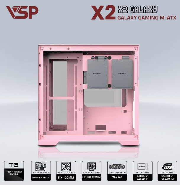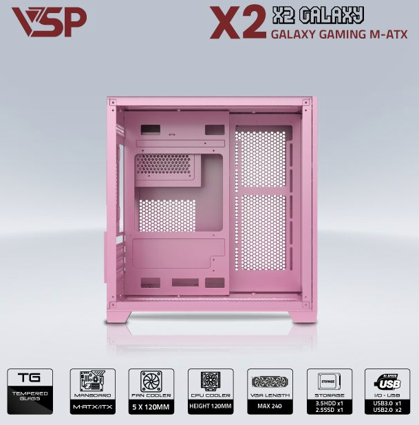 Vỏ case máy tính VSP AQUANAUT PRO GAMING M-ATX X2 GALAXY - Màu hồng, không kèm fan